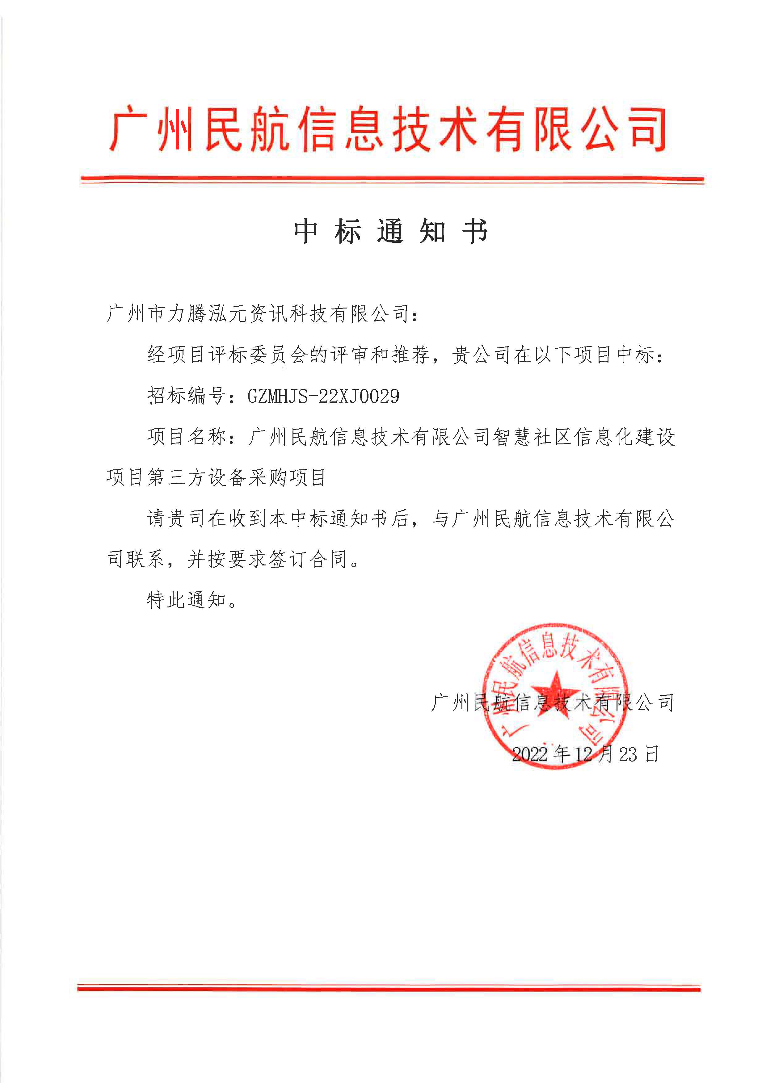 公(gōng)司喜(xǐ)報: 經過廣州民航信息技術有限公司(sī)項目評標委員會的評審和推薦,我公司中標以下項目: 招標編號:GZMHJS-22XJ0029 項(xiàng)目名稱:廣州民航信(xìn)息技術有限公(gōng)司智慧社區信息化建設項(xiàng)目第三方設備采購項目。請公(gōng)司商務部收到中標通知書後,及時與廣州民(mín)航信息技術有限公司聯係,並按要求簽訂合同。公司技術部同步組建項目部,開展的各項工作。