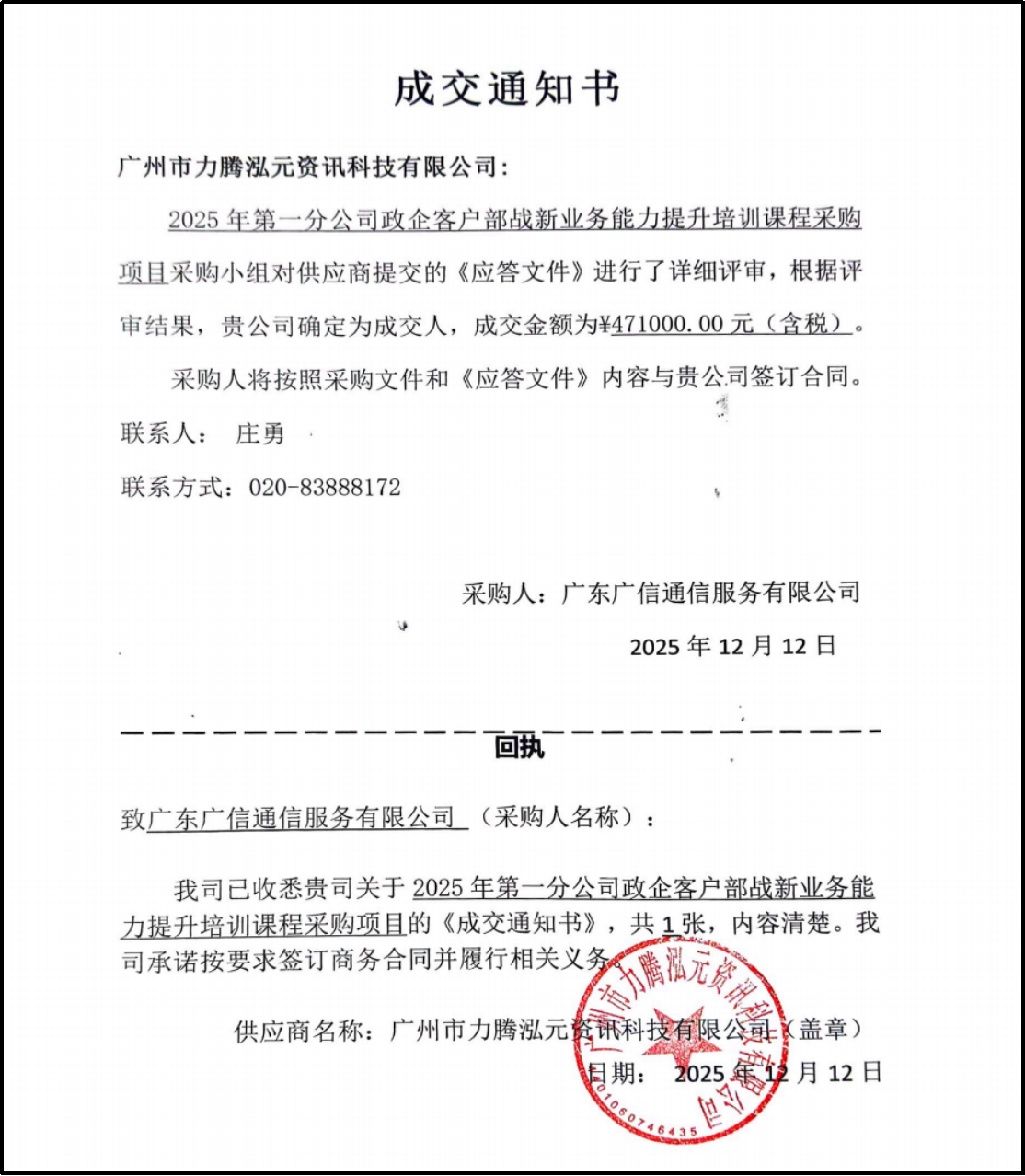 這份成交通知書,是鼓勵,更是新征程的起點。海角社区APP將(jiāng)以此(cǐ)為契,與(yǔ)客戶緊密協作,以優質的培訓服務助力(lì)能力提升,共(gòng)同為戰新業務的發展注入強(qiáng)勁(jìn)動力。未來,海角社区APP(men)將繼續砥礪前行,以專業和誠意,攜手客戶共創卓越!